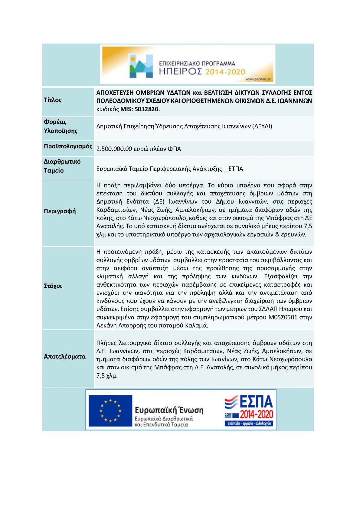 Τίτλος: Αποχέτευση Όμβριων Υδάτων και Βελτίωση Δικτύων Συλλογής Εντός Πολεοδομικού Σχεδίου και Οριοθετημένων Οικισμών Δ.Ε. Ιωαννίνων