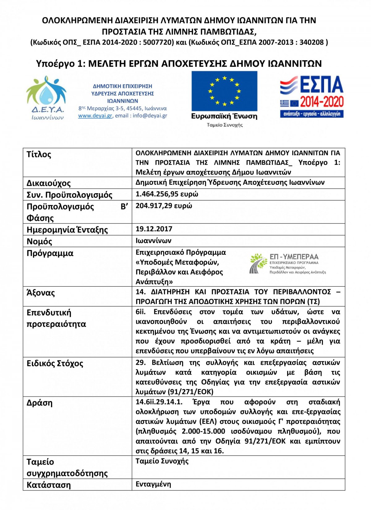 Πηγή Χρηματοδότησης Ταμείο Συνοχής